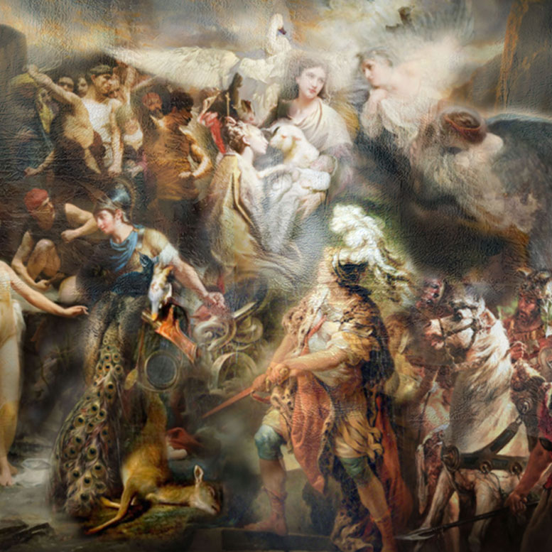 In this large-format piece, Iva Troj presents one of her most densely populated and ambitious compositions. This oil painting serves as a grand theater of metamorphosis, where Troj deconstructs the rigid dichotomies of classical art history to reveal a more fluid, human truth.